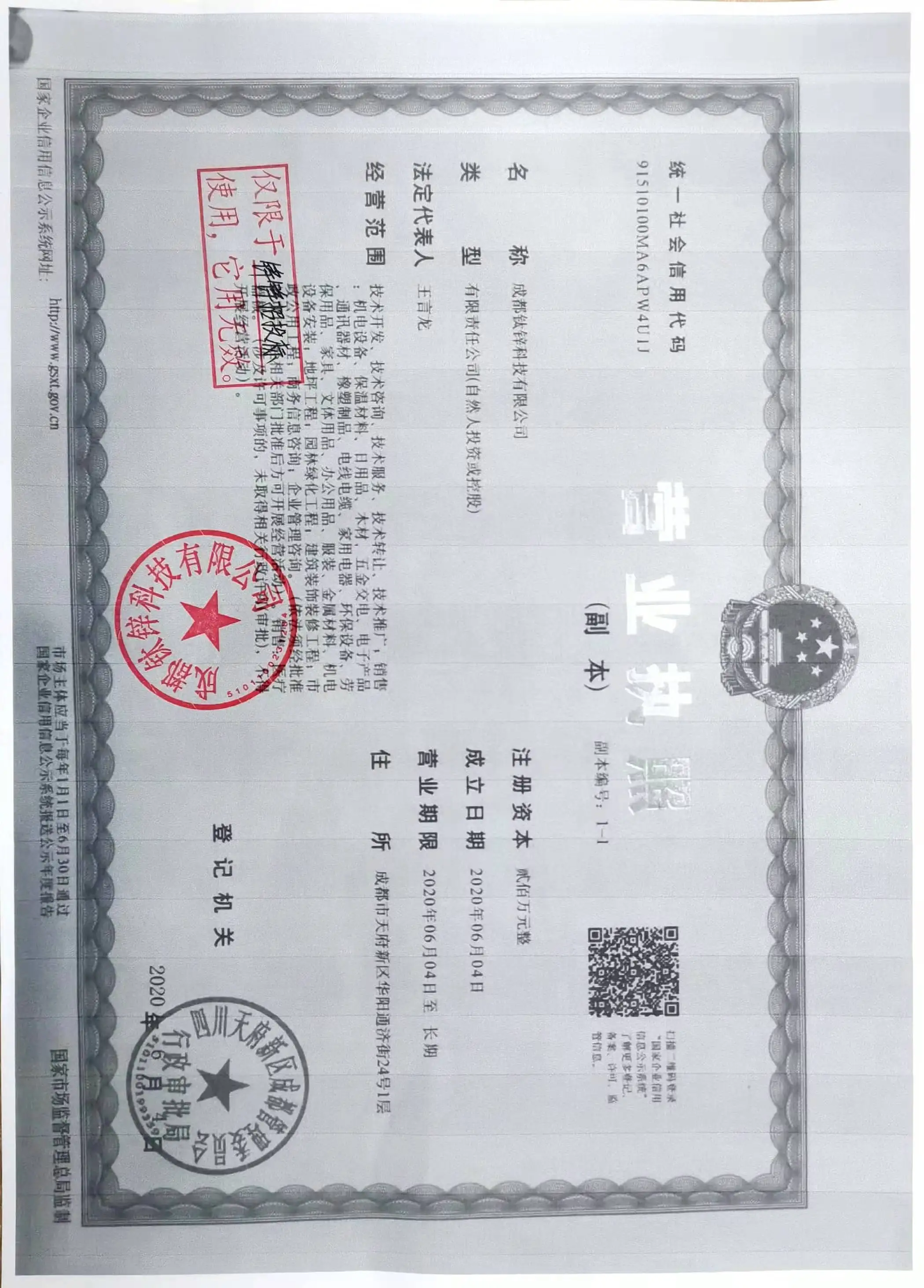 Registered address : 1st Floor, No. 24 Huayang Tongji Street Chengdu Sichuan China